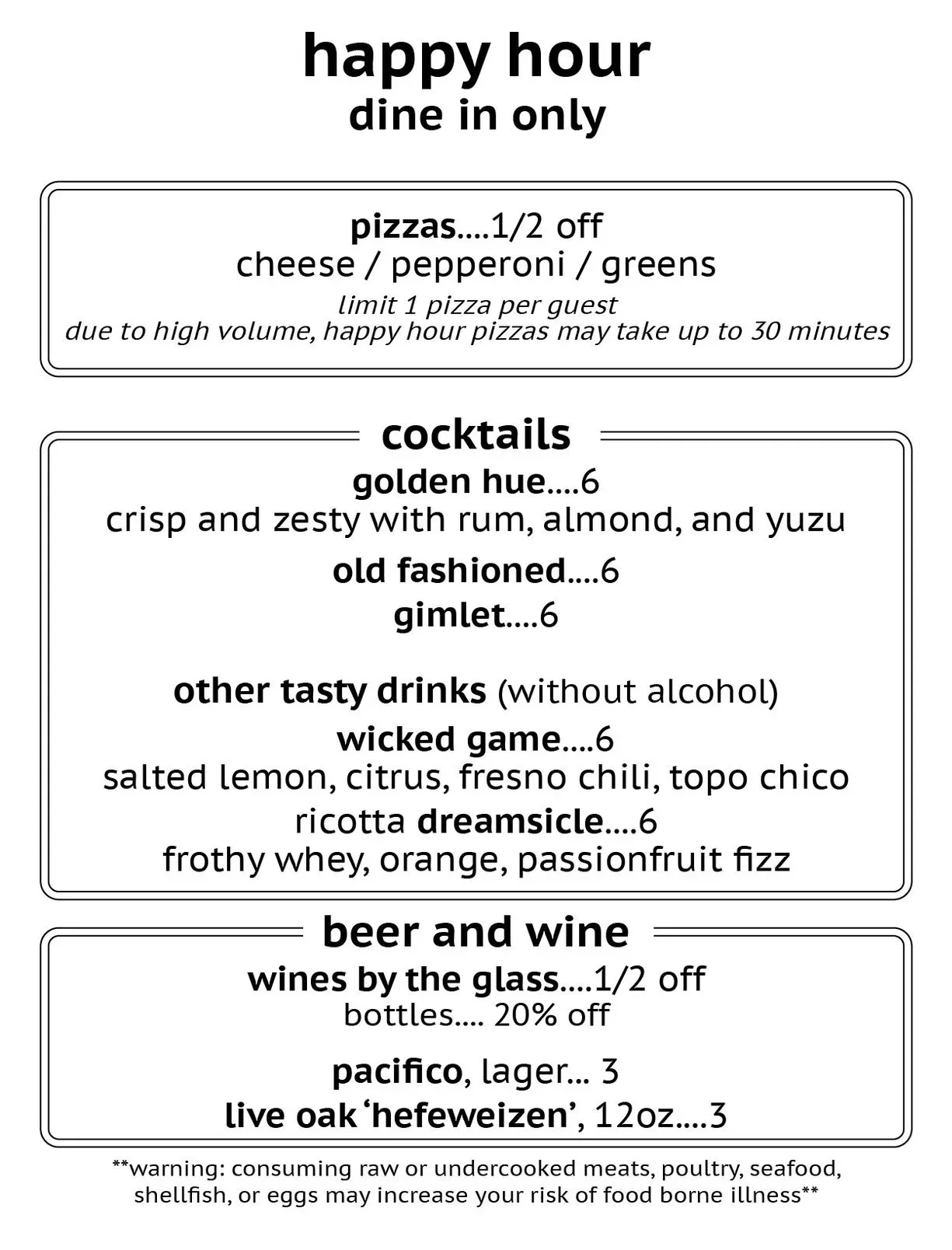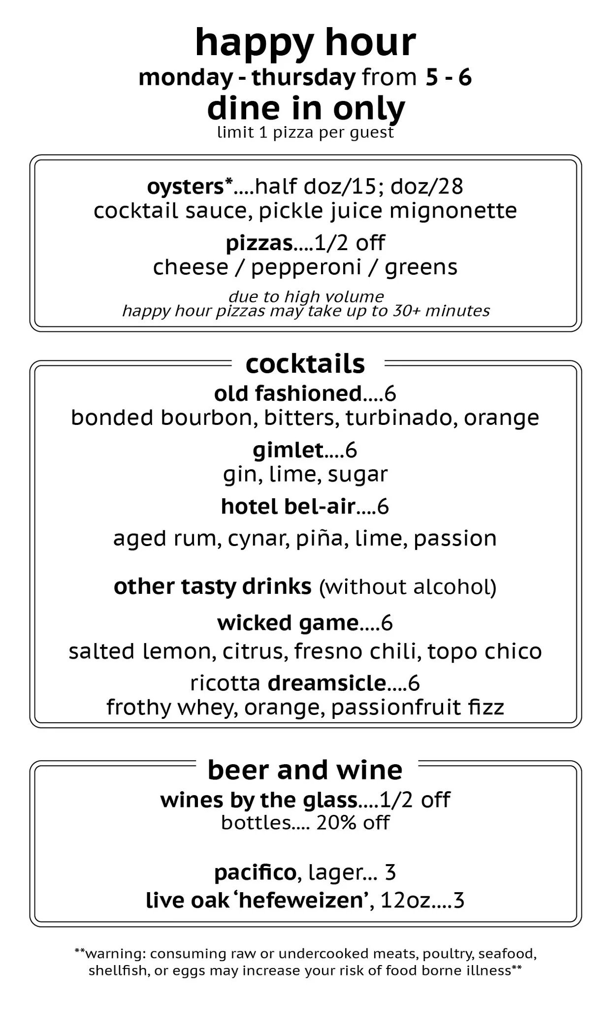 every monday - thursday from 5 - 6 pm (dine in only!)